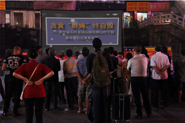 在三江公园首映现场,吸引600余人驻足观看,当看到《贪食“群蝇”终自毁》时,现场群众纷纷表示愤慨,当腐败分子被纪委送进监狱时,现场一片叫好声,时时响起阵阵掌声。该片警醒我们必须加强基层党组织建设,完善基层党员的监督机制,按照德才兼备、以德为先的原则选拔任用干部。必须加强村务公开、健全监督机制、提高工作透明度,必须加强廉政教育,引导广大干部增强廉政意识,提高拒腐防变能力,必须加强民生项目监督,坚决查处违纪违法行为。同时,告诫我们腐败没有特区,反腐败没有禁区,不管干部职务高低,不管涉案金额大小,只要破坏国家惠民政策,损害人民群众根本利益,都要被绳之以法,一切心存侥幸皆是枉然,最后结果只能是捞到手铐和铁窗。
