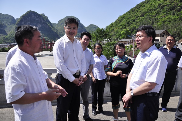 2017年5月3日,夏红民(右一)到兴义市顶效镇楼纳村调研,勉励干部群众大力发展乡村旅游,率先实现脱贫致富。