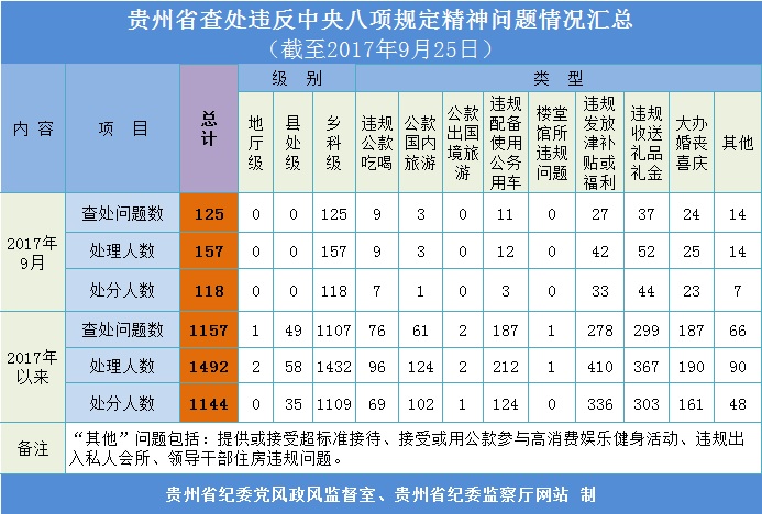 2017年1至9月,贵州省共查处违反中央八项规定精神问题1157起,处理1492人,处分1144人。