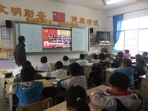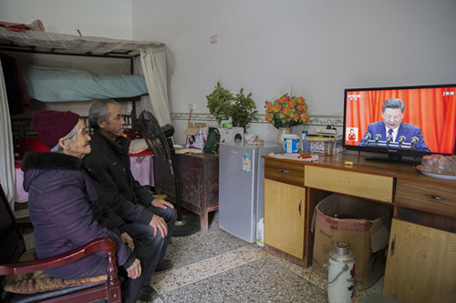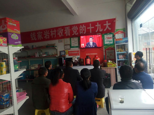 石阡县汤山街道万金庄村84岁老党员赵运英观看十九大开幕式