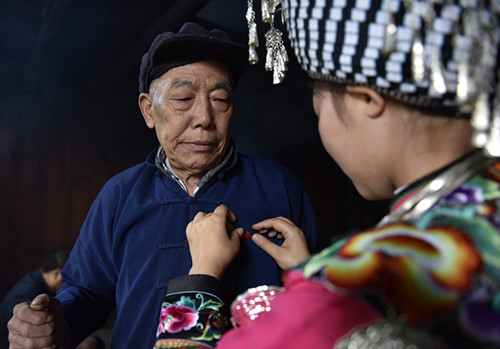 在党的十九大召开的重大日子,松桃苗族自治县盘石镇臭脑村年轻党员在为老年党员佩戴党徽