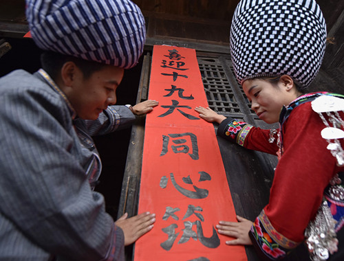 松桃苗族自治县盘石镇村民在贴对联庆祝十九大召开