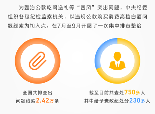 比如,为整治公款吃喝送礼等“四风”突出问题,中央纪委组织各级纪检监察机关,以违规公款购买消费高档白酒问题线索为切入点,在2017年7月至9月开展了一次集中排查整治,全国共排查出问题线索2.42万条。