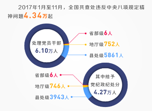 截至2017年11月底,全国共查处违反中央八项规定精神问题4.34万起;处理党员干部6.10万人,含省部级6人,地厅级752人,县处级5861人;给予党纪政纪处分4.27万人,含省部级6人,地厅级476人,县处级3943人。查处问题数、处理党员干部人数、给予党纪政纪处分人数均已超过去年全年总和。