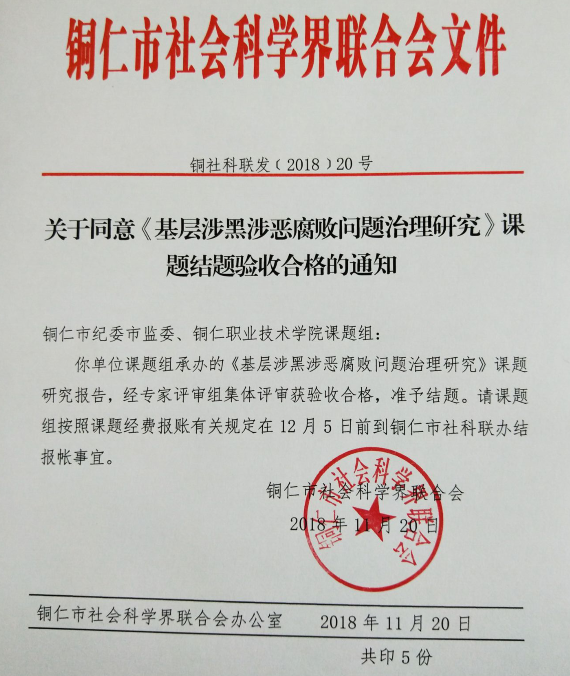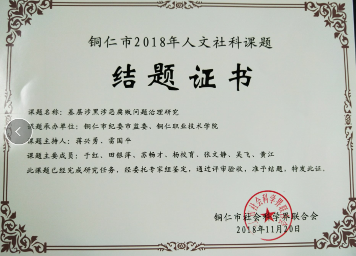 11月23日下午,市直社科界“纪念改革开放40周年·繁荣发展社会科学”座谈研讨会在市社科联召开。会议下发了2018年度铜仁市人文社科结题合格验收通知,颁发了结题证书。由铜仁市纪委市监委与铜仁职业技术学院(市廉政文化实证研究基地)联合承担的《基层涉黑涉恶腐败问题治理研究》课题顺利通过结题验收。