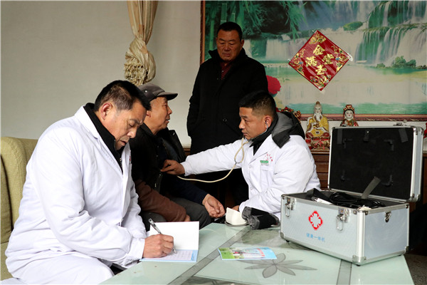 河南省鹿邑县各乡镇定期对贫困户家庭成员进行心电图检查、血压测量等健康检查,为贫困户送健康送温暖,让群众获得实实在在的实惠。图为太清宫镇卫生院医生对建档立卡贫困户入户义诊。