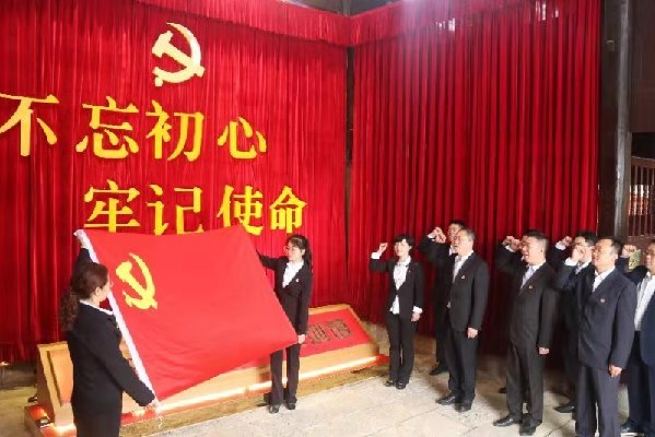 山花红遍,初心不改。在中共黔北工委旧址前,全体干部面对鲜艳的党旗,右手握拳,重温入党誓词,时刻铭记在党旗下立下的诤诤誓言。