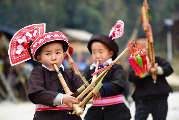 在“六·一”儿童节到来之际,榕江县古州三小一群天真烂漫的孩子身着苗族服装,吹芦笙、跳起舞,正在参加富有传统特色和地方特色的体育运动,校园里激荡着欢声笑语。(黔东南州榕江县纪委监委供 吴胜铭 摄)