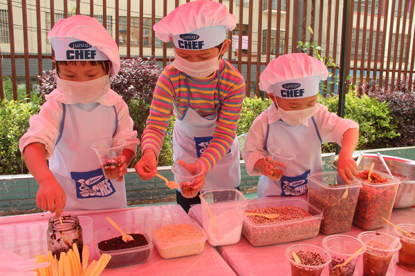 为“寓教于乐”,培养锻炼孩子们的动手能力,盘州市第二幼儿园开展“六一节” 体验活动。图为孩子们正扮演 “厨师”、“服务生”、“顾客”,在鼓励儿童们勤动手、多动脑的同时,也让孩子们体验家长的辛劳。(六盘水盘州市纪委监委供 刘畅 摄)