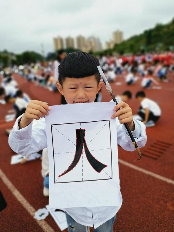 “人之初,性本善。”六一节前夕,普定县第四小学组织开展书法比赛,孩子们一起提笔书写“人”字,旨在教育学生要从小做一个善良正直的人。图为一名学生在展示他刚写好的字。(安顺市普定县纪委监委供 骆世明 摄)