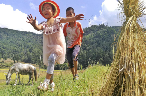 “六一节”前夕,在龙里县龙山镇平山村,两个孩子正在田间地头追逐嬉戏,欢度童年。(黔南州龙里县纪委监委供 罗显琴 摄)