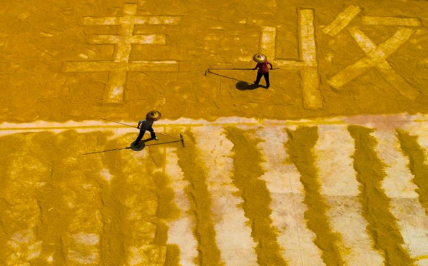 金秋九月,稻子飘香。图为铜仁市松桃苗族自治县的农户趁着晴朗天气,正在抢收稻谷,晾晒谷子。(铜仁市松桃县纪委监委供 龙元彬 摄)