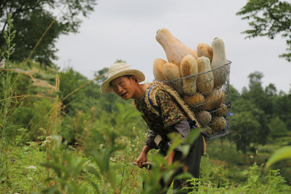 今年毕节市织金县自强乡引进优质南瓜品种,采取“龙头企业+村集体合作社+农户”的组织方式,发动群众种植南瓜3000余亩,南瓜成为了当地群众脱贫致富的“金瓜”。图为南瓜丰收群众采收的情景。(毕节市织金县纪委监委供 杨忠云 摄)