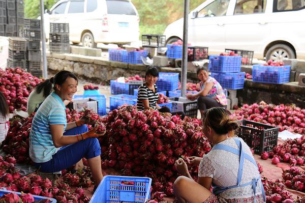 安顺市镇宁自治县良田镇的脱贫主导产业是火龙果,今年火龙果迎来丰产期,当地种植户们高兴而又忙碌地挑选装箱,把一年的收成搬进一辆辆销往全国各地的货车上。(安顺市镇宁自治县纪委监委供 周庆子 摄)