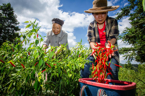 贵阳市开阳县大力调整农村产业结构,通过科学指导农民耕地、栽种、管护、采收等,使当地农户收入实现倍增。图为当地农户们正在采收富硒优质满天星朝天椒。(贵阳市纪委监委供 郑宇潇 摄)