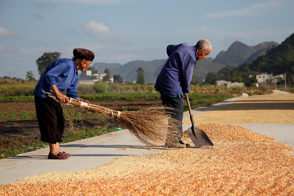 在秋日暖阳中,黔西南州贞丰县对家寨的两位老人正在摊晒新收的玉米粒,这一颗颗金黄的玉米粒,见证了这个家庭一年的付出和丰收的喜悦。(黔西南州贞丰县纪委监委供 郭泽玉 摄)