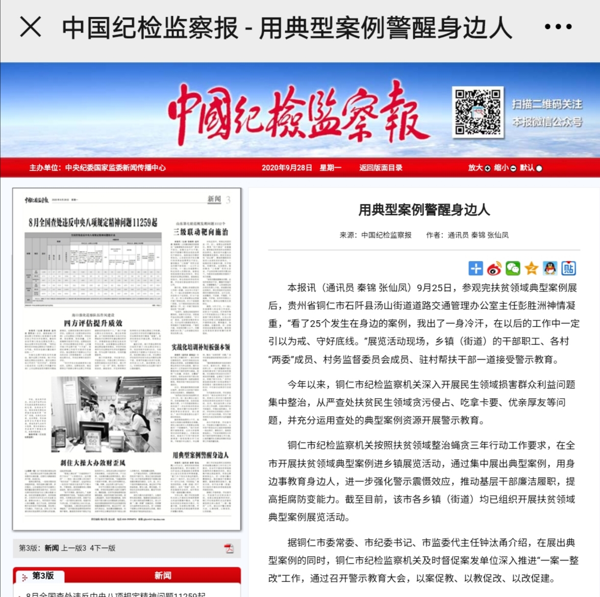 铜仁市纪检监察机关按照扶贫领域整治蝇贪三年行动工作要求,在全市开展扶贫领域典型案例进乡镇展览活动,通过集中展出典型案例,用身边事教育身边人,进一步强化警示震慑效应,推动基层干部廉洁履职,提高拒腐防变能力。截至目前,该市各乡镇(街道)均已组织开展扶贫领域典型案例展览活动。