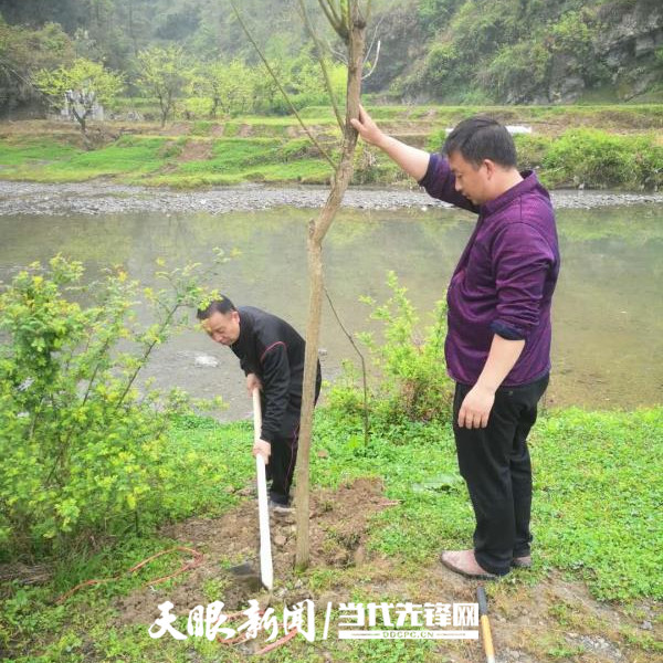 袁仁东和驻村干部一道为村里道路两旁栽植花树。