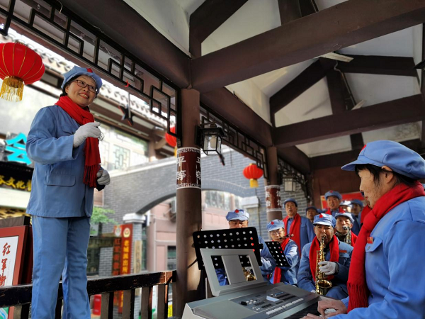在遵义老城红军街上,经常能看到一群老年人身着红军服饰在演奏红色歌曲。他们是由退休职工、老党员组成的“红色合唱团”,高昂的歌声表达了他们对祖国的热爱、对生活的赞美。(遵义市新蒲新区纪检监察工委供 郑海海 摄)