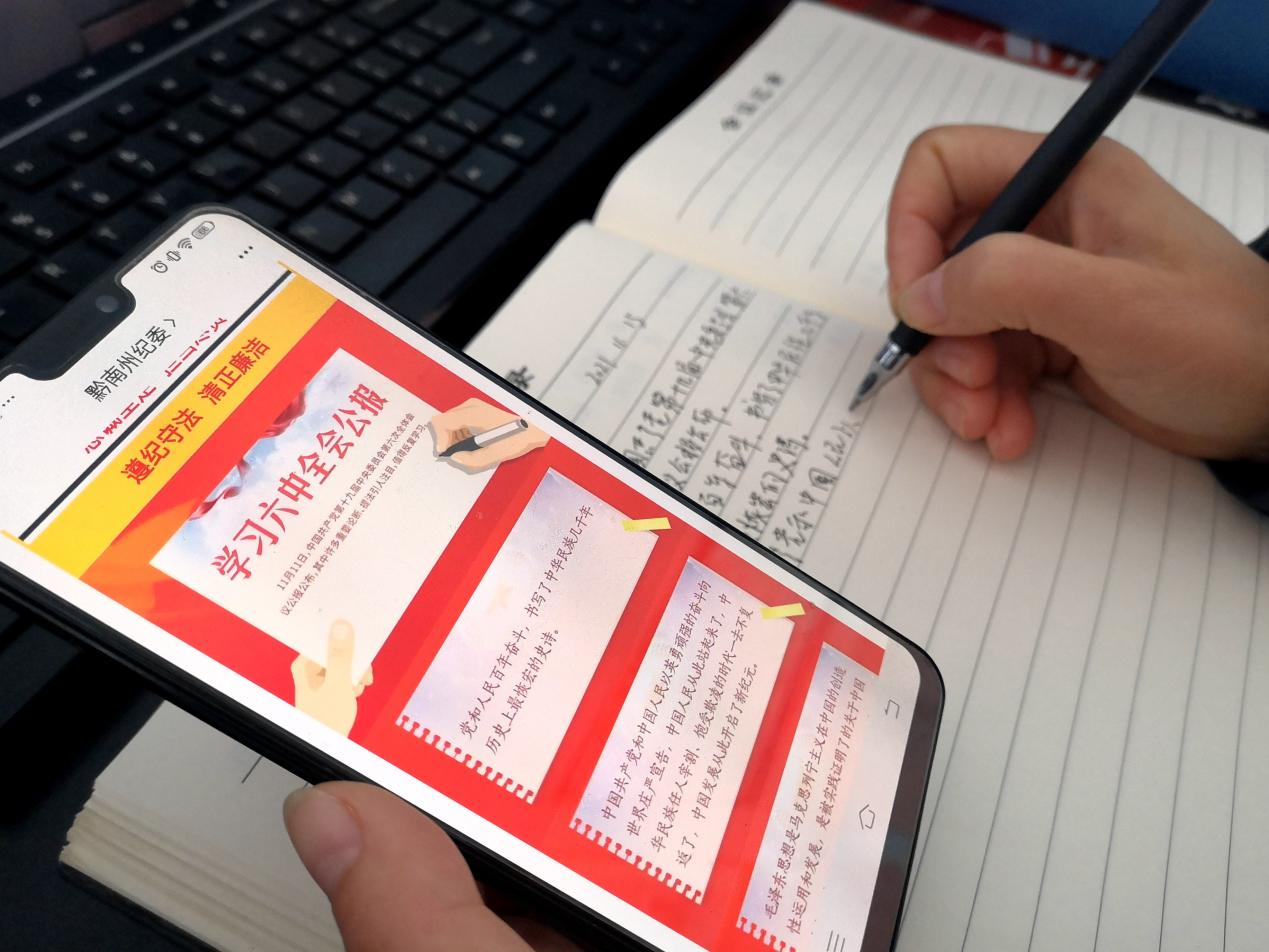 为深入学习领会十九届六中全会精神,黔南州罗甸县纪委监委在及时组织线下学习的同时,积极开展线上学习宣传活动,通过微信公众号转载评论员文章、全会解读等帮助党员干部及时跟进学习全会精神。图为该县一纪检监察干部利用微信公众号对全会公报内容进行再学习。(黔南州罗甸县纪委监委供 安义 摄)