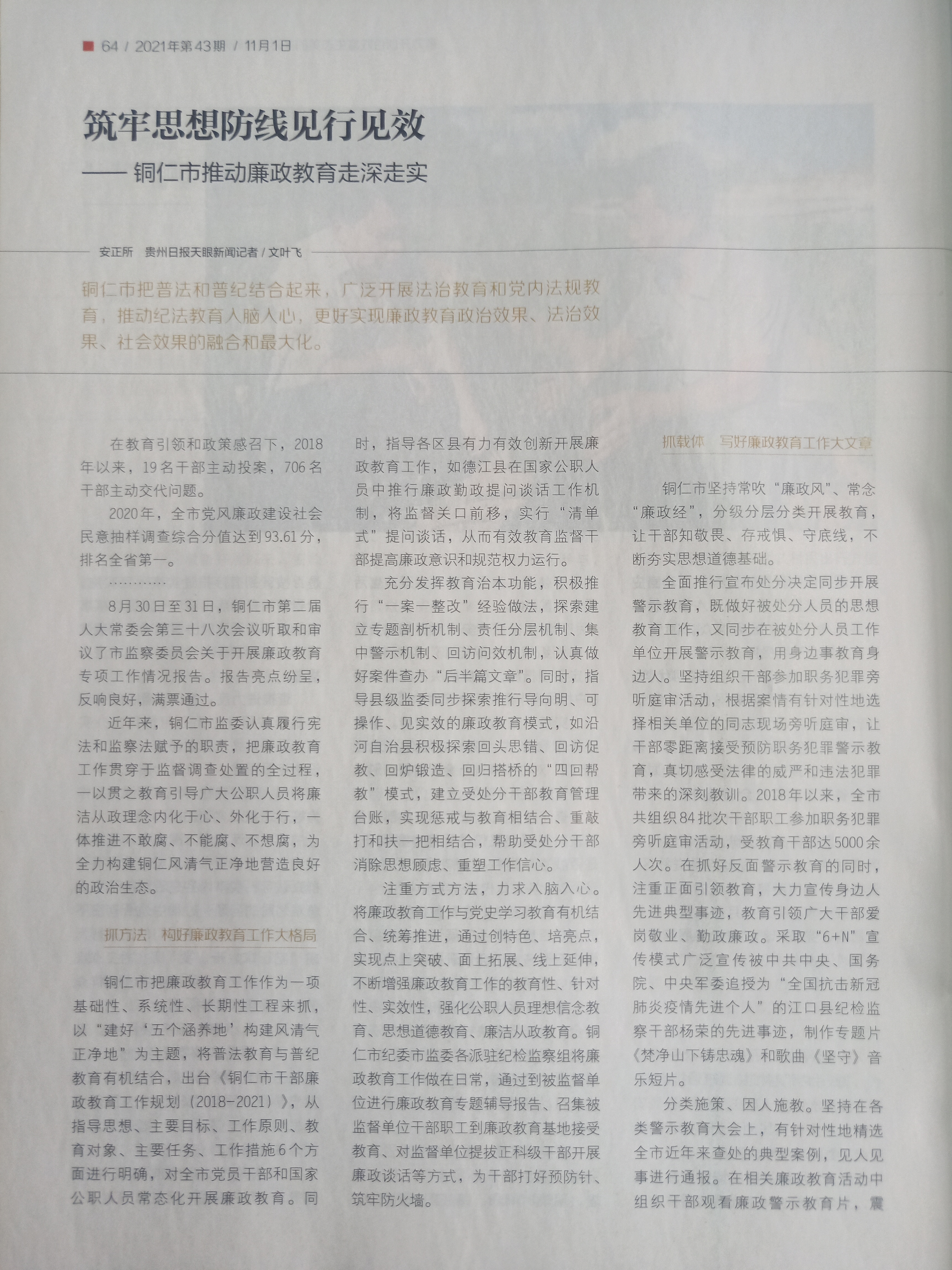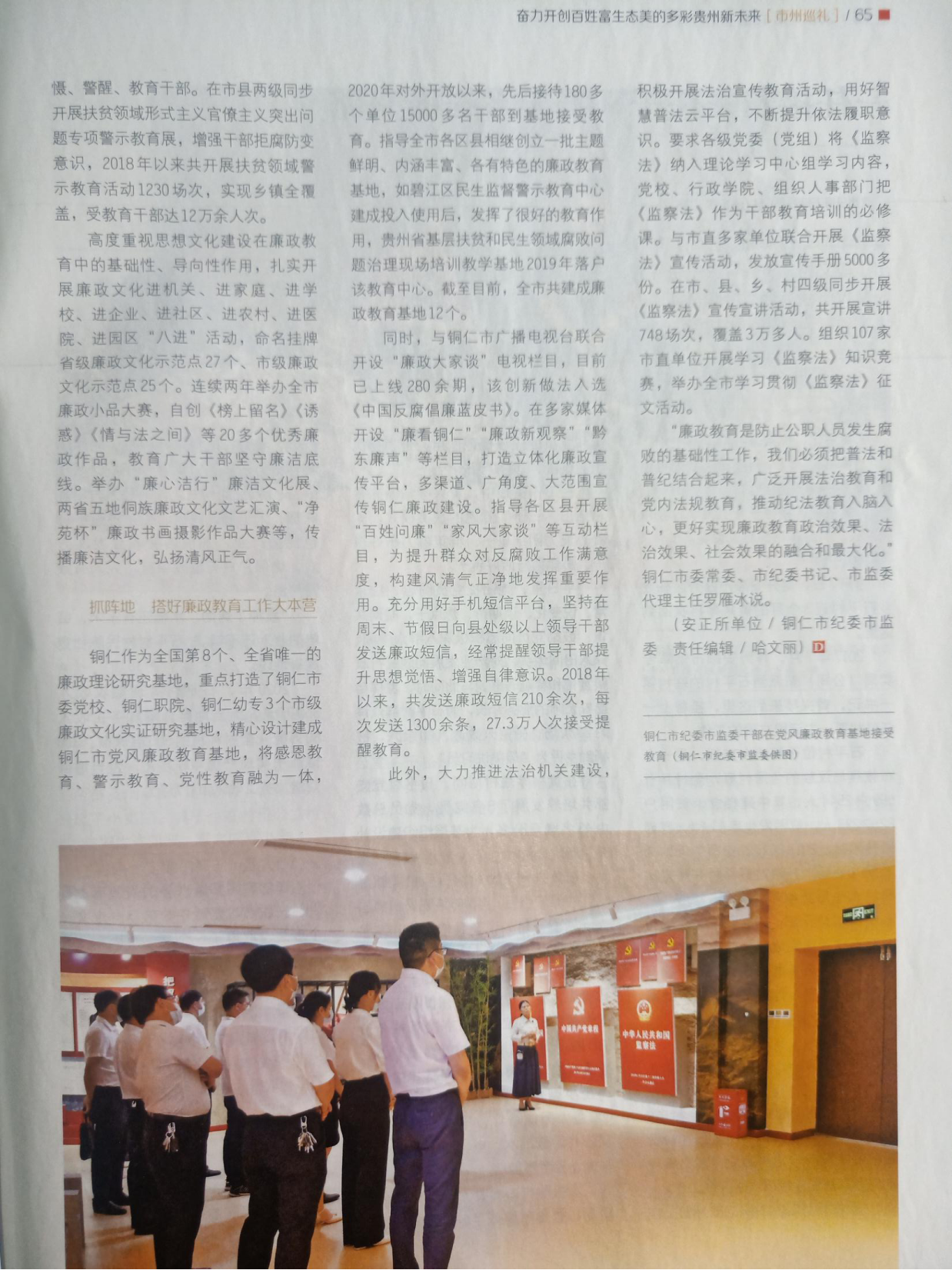 与铜仁市广播电视台联合开设“廉政大家谈”电视栏目,目前已上线280余期,该创新做法入选《中国反腐倡廉蓝皮书》。在多彩贵州网、铜仁日报、铜仁广播电视台等媒体开设“廉看铜仁”“廉政新观察”“黔东廉声”等栏目,打造立体化廉政宣传平台,多渠道、广角度、大范围宣传铜仁廉政建设。指导各区县开展《百姓问廉》、“家风大家谈”等互动栏目,为提升群众对反腐败工作满意度,构建风清气正净地发挥重要作用。充分用好手机短信平台,坚持在每周星期五和节假日,充分用好手机短信平台,坚持在元旦春节、中秋国庆等节假日和每周星期五,向全市县处级以上领导干部发送廉政短信,经常提醒领导干部提升思想觉悟、增强自律意识。2018年以来,共发送廉政短信210余次,每次发送1300余条,27.3万人次接受提醒教育。将宪法、监察法等法律法规编入《领导干部廉洁从政教育读本》,发放《公职人员廉政教育工作手册》,供全市广大干部学习。