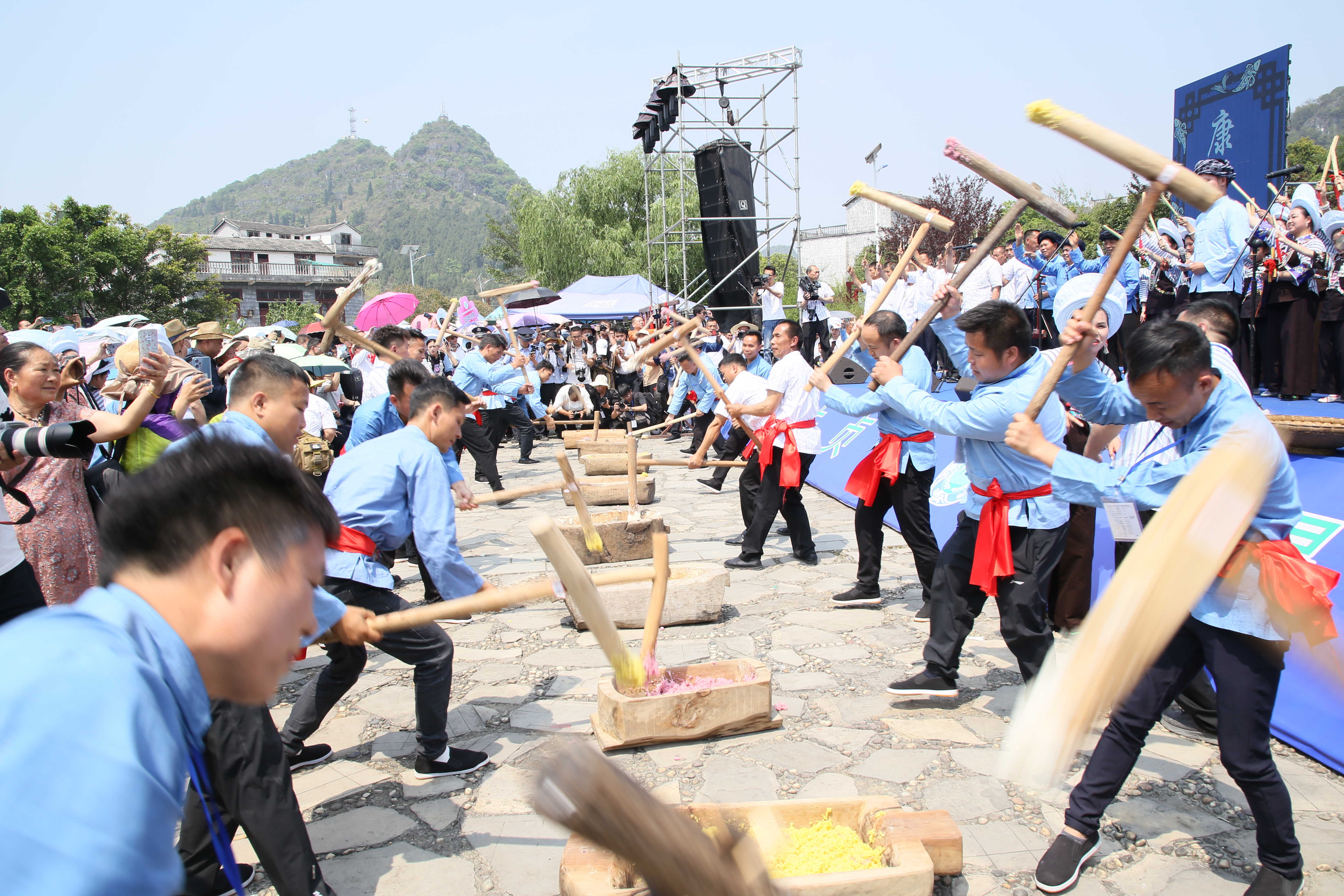 近日,在贞丰县永丰街道必克村举行2023年布依族“三月三”民俗文化节活动,布依族同胞身着节日盛装,通过对镜梳妆、打糠包、品长桌宴、跳篝火舞等多种形式开展丰富多彩的民俗活动,欢庆传统佳节。图为该村群众开展非遗产展示活动。(黔西南州贞丰县纪委监委供 王俊 摄)