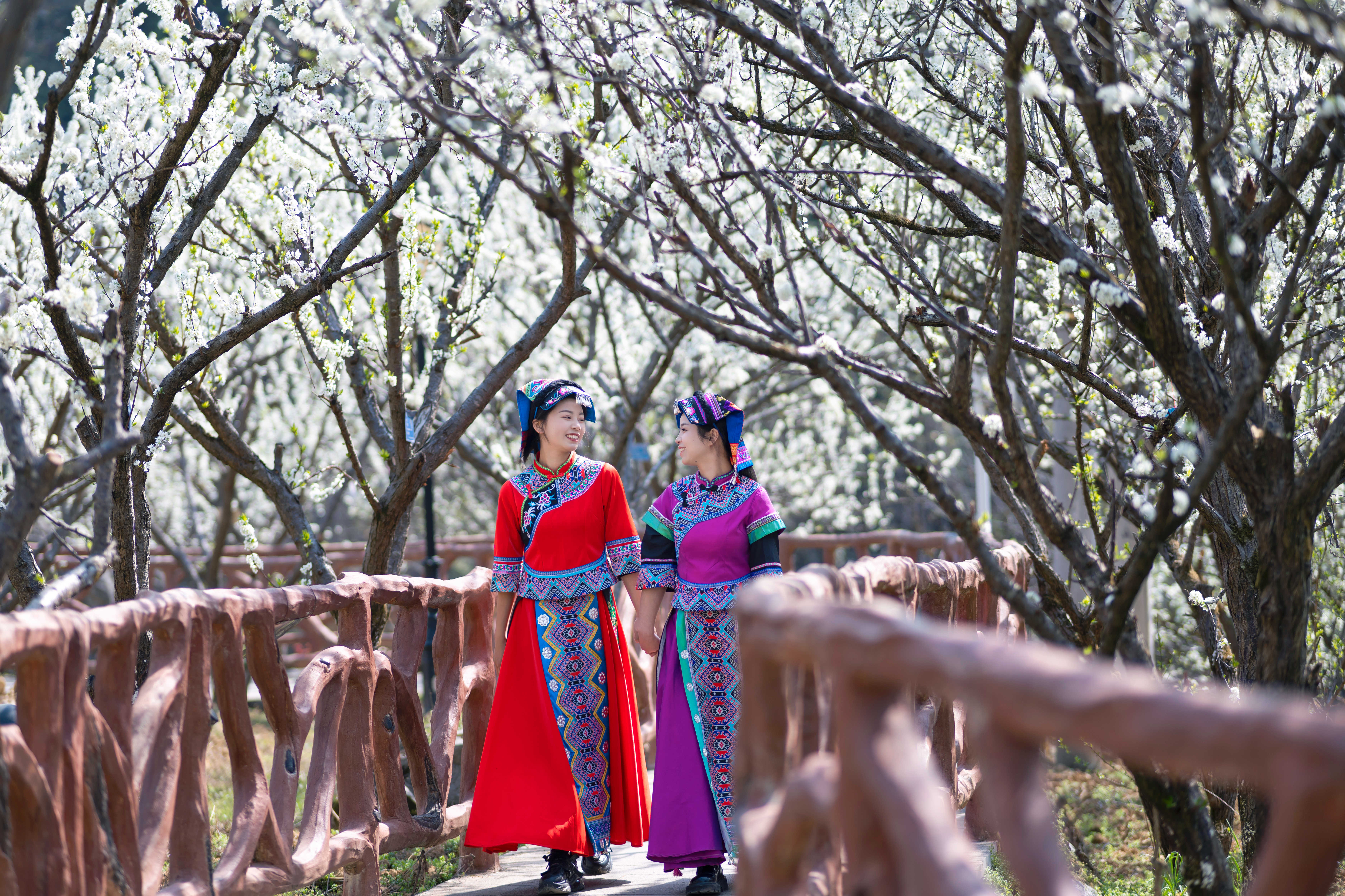 李花怒放一树白,漫山飘香迎客来。春末夏初时节,一簇簇洁白的花朵绽放枝头,宛如覆盖了一层层雪花,馨香扑鼻,令人陶醉,土家姑娘身着民族盛装,行走在花海间,形成一道独特亮丽的风景。(铜仁市思南县纪委监委供 何其波 摄)