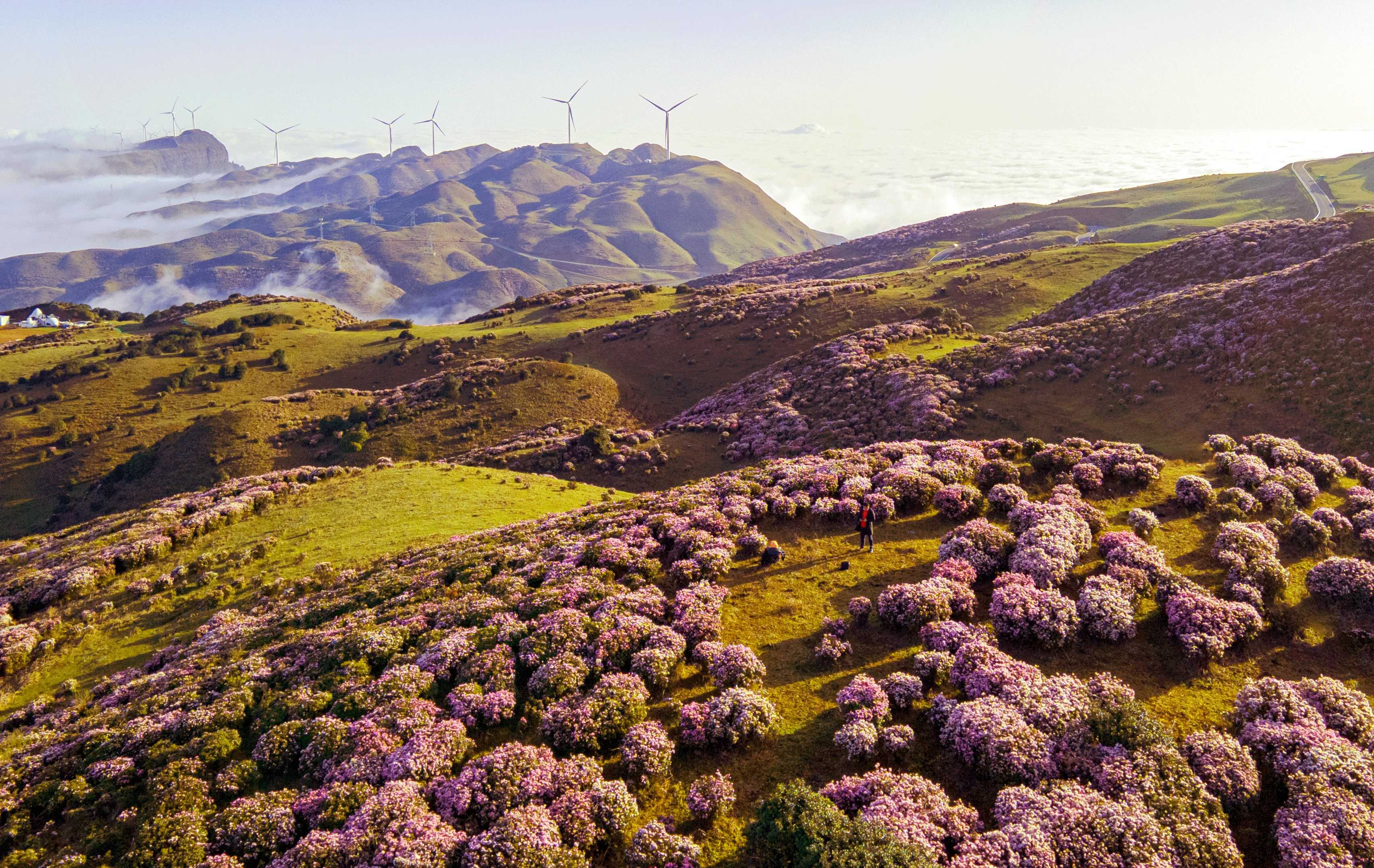 人间四月天,乌蒙赏杜鹃。四月的乌蒙大草原,高山杜鹃争相绽放,一坡坡、一片片,路旁谷边、高低远近,漫山遍野蔚为壮观。纵目眺望,斑斓的花海从山顶一泻而下,与云海交织缠绕,香气浮动间,成就一幅妙笔丹青的春日画卷。(六盘水市盘州市纪委监委供 赵康华 摄)