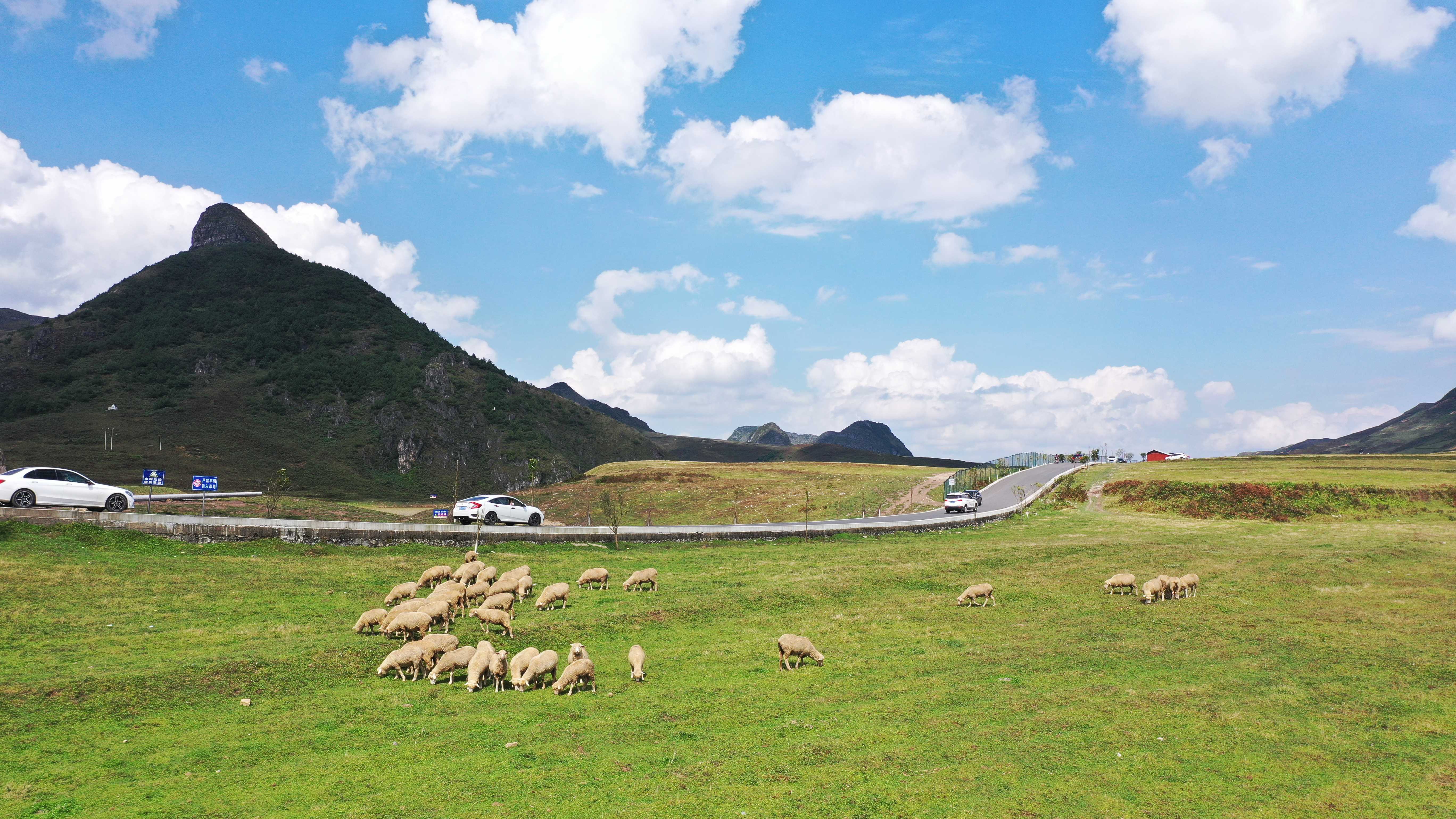 大美四月,春风和煦。羊群在赫章县阿西里西大草原上悠闲吃着青草,和蓝天白云相互映衬,勾勒出一幅美丽的高原牧场景象。(毕节市赫章县纪委监委 郭光荣 摄)