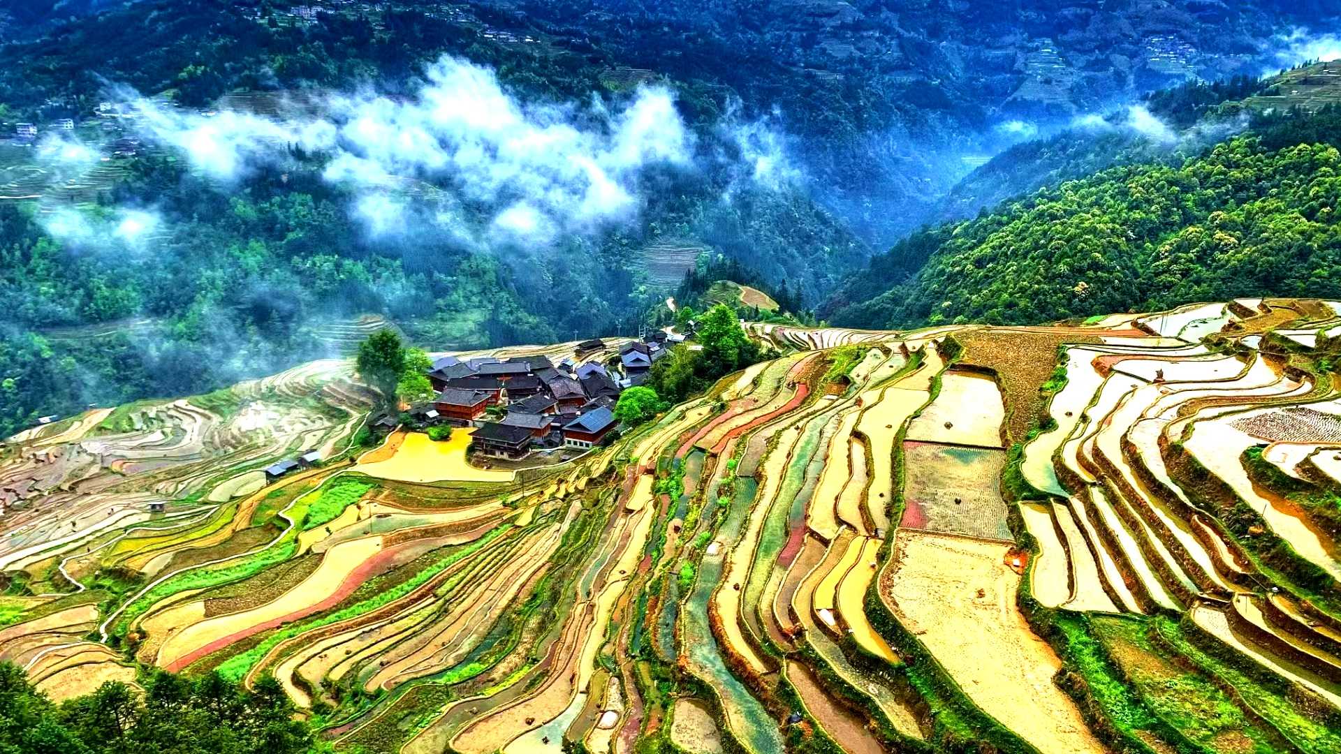 人间最美不过四月天。一场春雨过后,从江县加榜梯田蓄水充盈,层层叠叠,色彩斑斓,云雾缭绕,如诗如画。(黔东南州从江县纪委监委供 罗刚 摄)