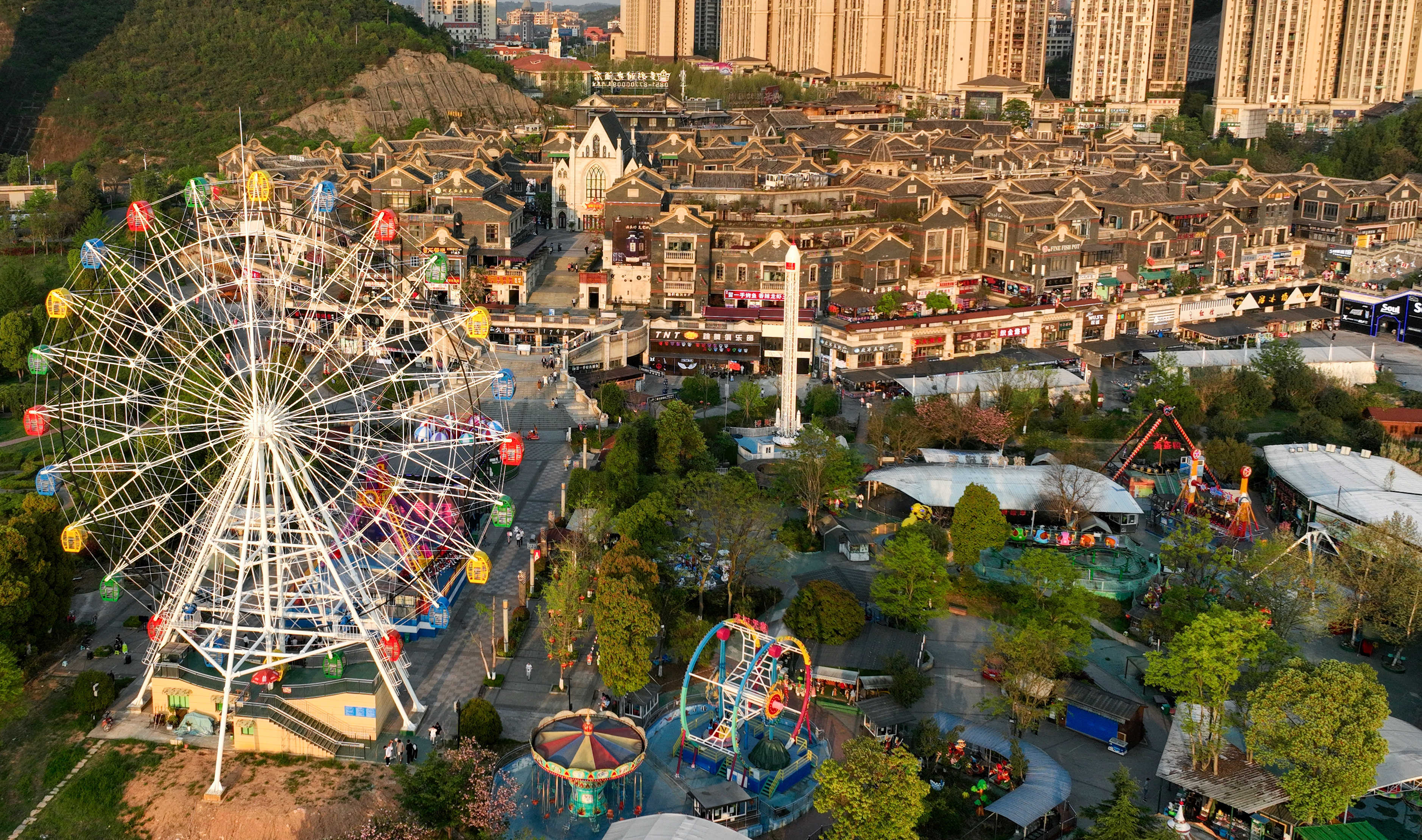 暮春时节,夕阳下的时光贵州古镇,余晖洒在摩天轮上,为忙碌的时光留下一份闲情。(贵阳市清镇市纪委监委供 王学超 摄 )