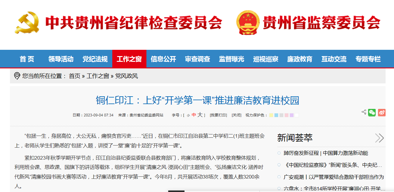 紧扣2023年秋季学期开学节点,印江自治县纪委监委联合县教育部门,将廉洁教育纳入学校教育整体规划,利用班会课、思政课、国旗下的讲话等载体,组织学生开展“清廉之风·浸润心田”主题班会、“弘扬廉洁文化·涵养时代新风”清廉校园书画大赛等活动,上好廉洁教育“开学第一课”。今年8月,共开展活动38场次,覆盖人数3200余人。