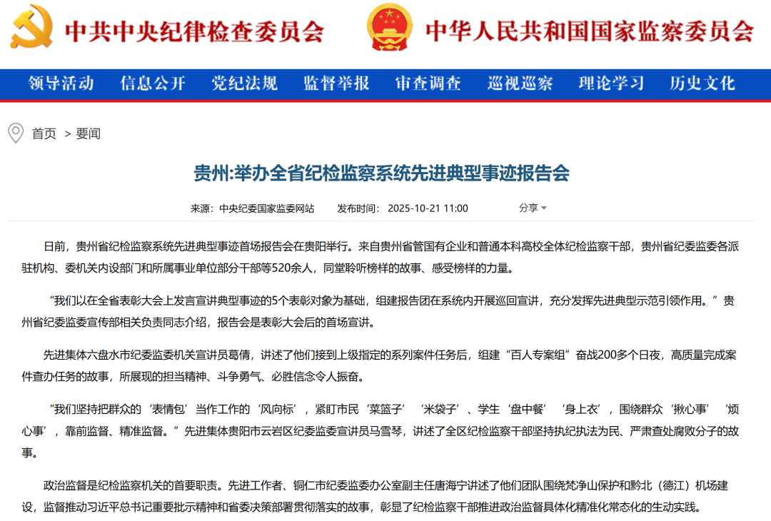 “先进是看得见的标杆,榜样是感受得到的力量。报告的事迹大多是发生在我们身边的事,可学可做、可追可及,希望同志们对标先进、学习先进、成为先进。”贵州省纪委监委相关负责同志会上强调。按照安排,报告团还将赴9个市(州)举行先进典型事迹报告会,持续在全系统掀起学习先进、争当先进的热潮。(作者:马红梅)